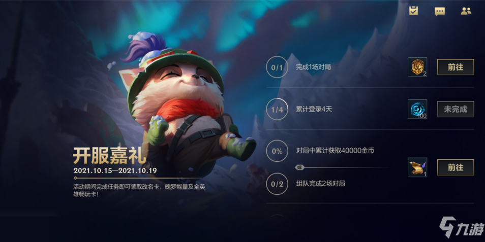亲爱的召唤师: 为答谢广大召唤师对《英雄联盟手游》的支持和关注,庆祝开服一周,我们准备了“开服嘉礼”活动,免费赠送改名卡、全英雄畅玩卡奖励给大家,活动详情如下: 开服嘉礼活动:免费领取改名卡 活动时间:10月15日0点——10月19日23点59分 活动期间,只需要登录游戏完成简单的任务,就能领取改 阅读全文...