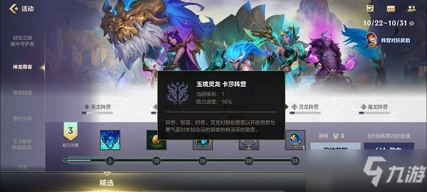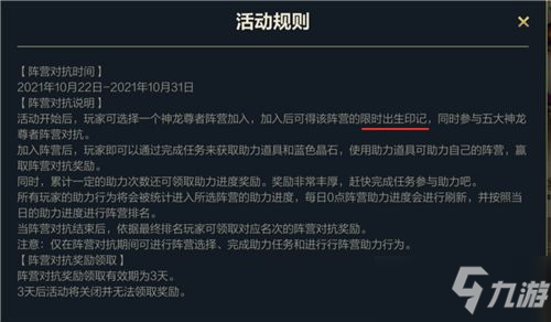 英雄联盟手游神龙尊者活动一览 加入阵营,对抗赢奖励 01阵营对抗时间 2021年10月22日-2021年10月31日 02阵营对抗说明 召唤师先选择一个神龙尊者阵营加入,并参与对抗。对抗期间,完成任务可得助力道具和蓝色晶石。助力道具可用于助力所选阵营,赢取阵营对抗奖励。同时,累计助力次数还可领取里程碑奖励。 所有召唤师的助力行为会被统计入所选阵营的助力进度,并进行排名,每日0点刷新进度和排名。当对抗结束后,依据最终排名召唤师可领取对应名次的阵营对抗奖励。 03加入奖励 对应阵营限时的出生印记 04任务奖励 蓝色晶石*4200 05里程碑奖励 神龙尊者阵营头像 击败印记:闪耀龙蛋 神龙尊者英雄姿态或皮肤姿态*1 神龙之环头像框 神龙尊者姿态精选宝箱*1 06阵营对抗第一名奖励 神龙尊者升级头像 限时出生印记 蓝色晶石*1550 队伍加成卡*2 07阵营对抗其余名次奖励 蓝色晶石*1550 队伍加成卡*2 神龙尊者一共分为五个阵营,你们会选择加入谁的阵营呢?快选择一个自己喜爱的阵营加入吧!"> LOL手游神龙尊者活动怎么玩?LOL手游神龙尊者活动现在已经正式开始了,玩家需要选择正确的阵营,胜利之后就能获取大量丰富的奖励,接下来就和小编一起来看看详细的活动介绍。 英雄联盟手游》神龙尊者活动一览 神龙尊者活动怎么玩" src="https://media.9game.cn/gamebase/ 阅读全文...