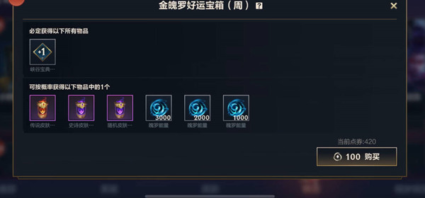 英雄联盟手游金魄罗宝箱概率一览 1:普通皮肤宝箱的概率是百分之三,史诗皮肤宝箱的概率是百分之1.9; 2:传说皮肤宝箱的概率是百分之0.1,其他的就是一定数量的魄罗能量; 3:这个金魄罗宝箱是每周限购一个,售价是100点券,也就是十块; 4:你想要开出传说或者史诗的皮肤宝箱概率是千分之一和五十分之 阅读全文...