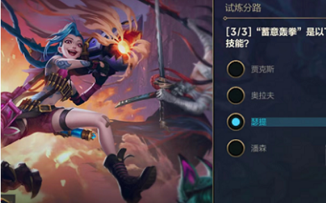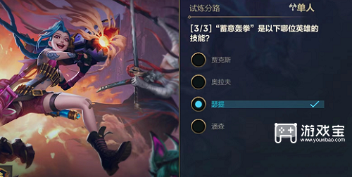 英雄联盟手游能力试炼者今天开启了单人路的答案,玩家需要根据题目选择出正确答案,小编带来英雄联盟手游能力试炼者单人答案攻略分享,一起来看看吧。 英雄联盟手游能力试炼者单人答案攻略分享 1、“蓄意轰拳”是以下哪位英雄的技能? 答:瑟提。 2、奥拉夫大招描述错误的是? 答:免疫所有控制效果,除击飞外。 阅读全文...