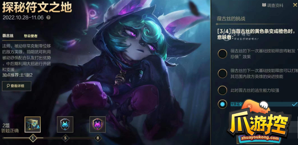英雄联盟手游探索符文之地答案是什么?探索符文之地是英雄联盟手游中的一个活动,玩家需要根据题目回答问题,那么英雄联盟手游探索符文之地怎么玩?下面小编整理了英雄联盟手游探索符文之地答案大全,希望可以帮助到大家。 英雄联盟手游探索符文之地答案大全 第一题: 当薇古丝的黄色条变成橙色的时候意味着什么? 阅读全文...